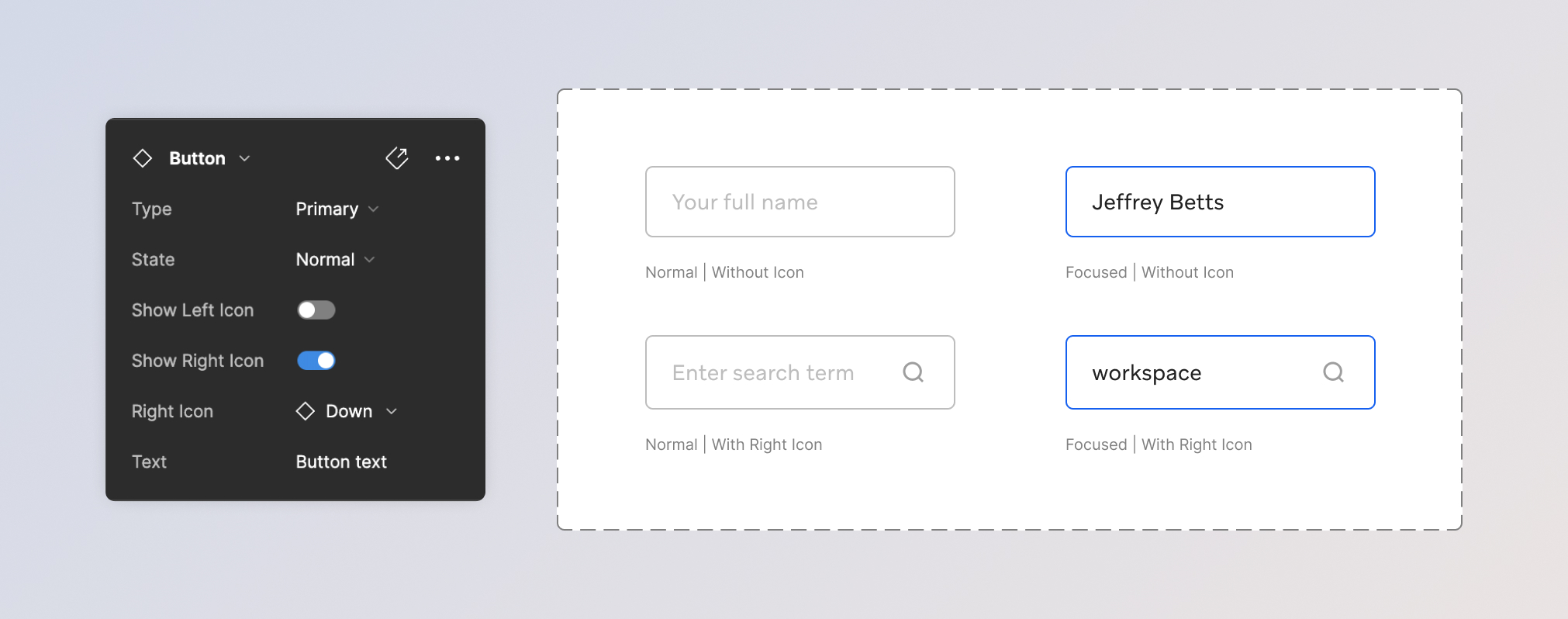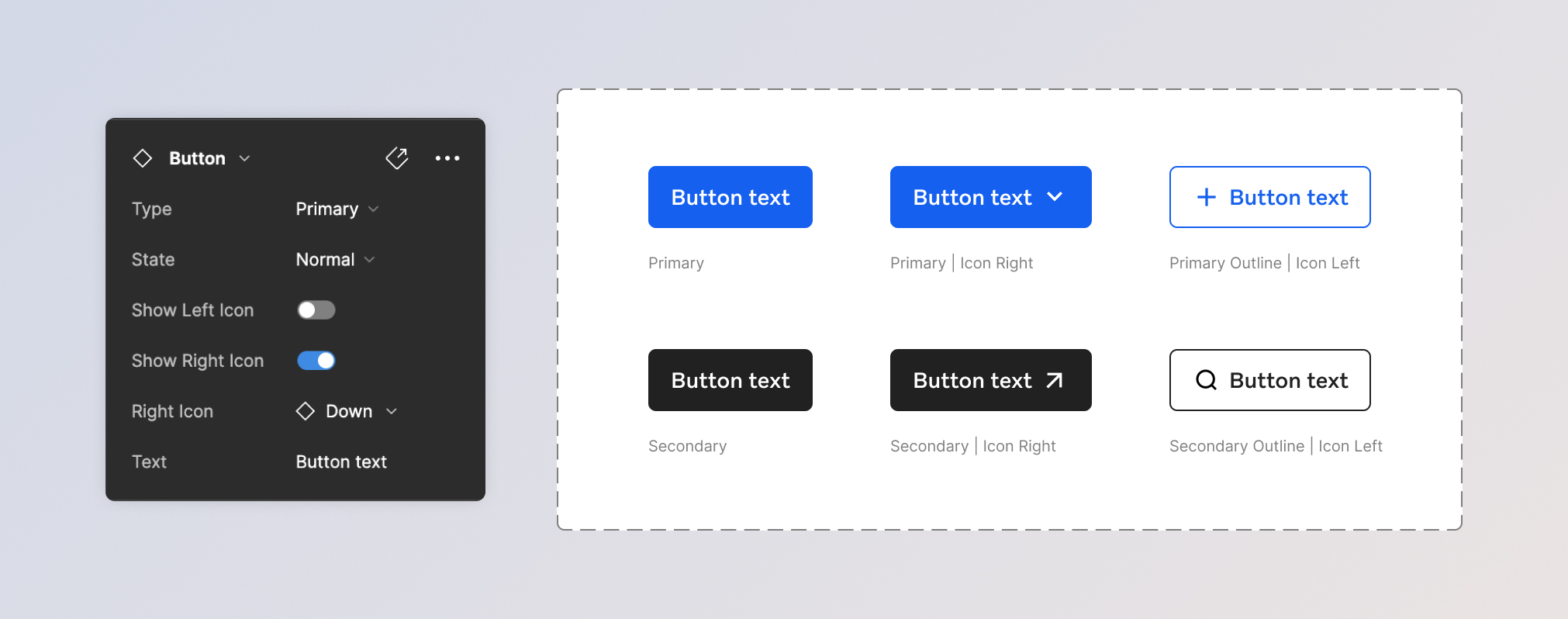 The Button component consists of different types and icon positioning variations