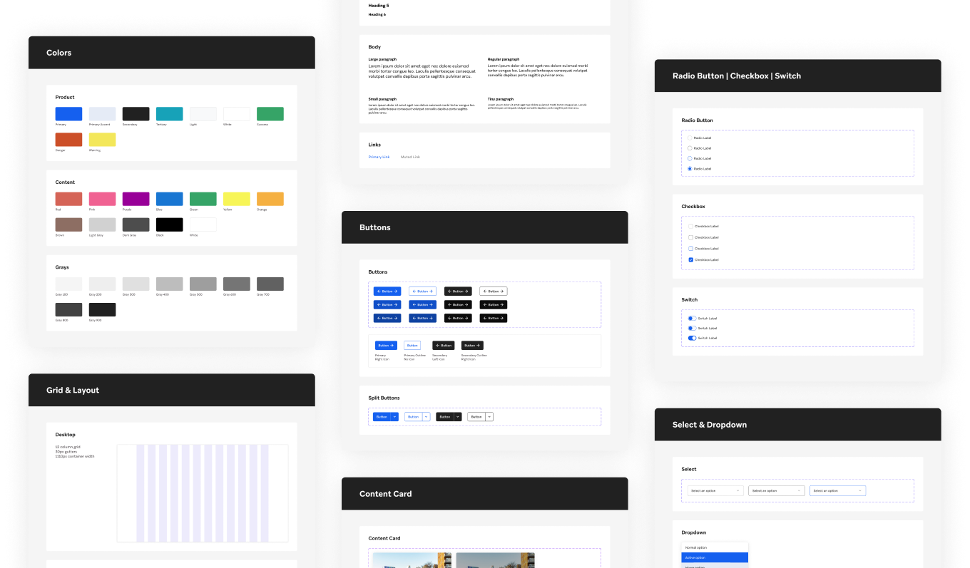 The Macro Component Library consists of common reusable interface elements and features, such as buttons, cards, text input fields, and select dropdown menus.