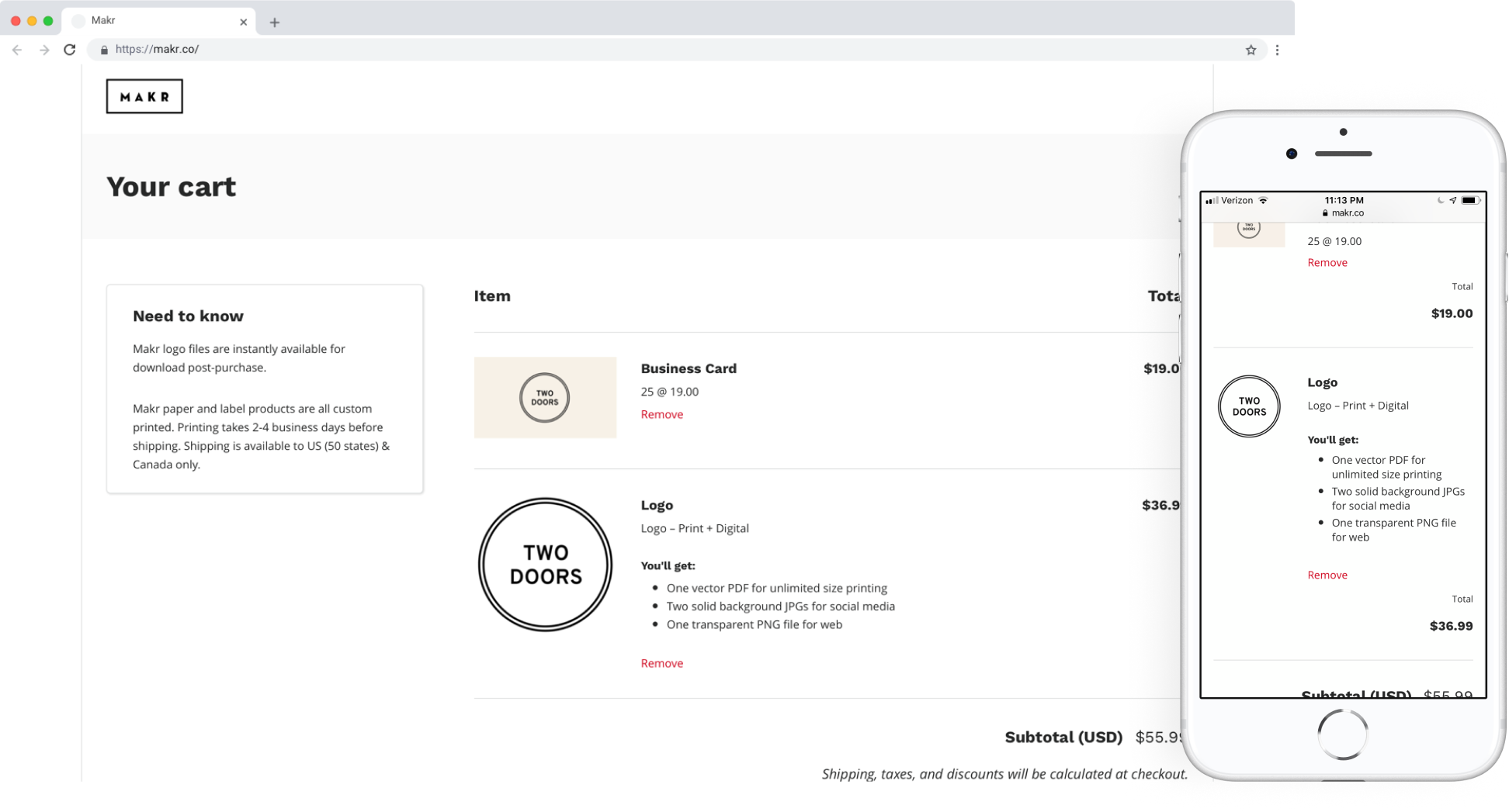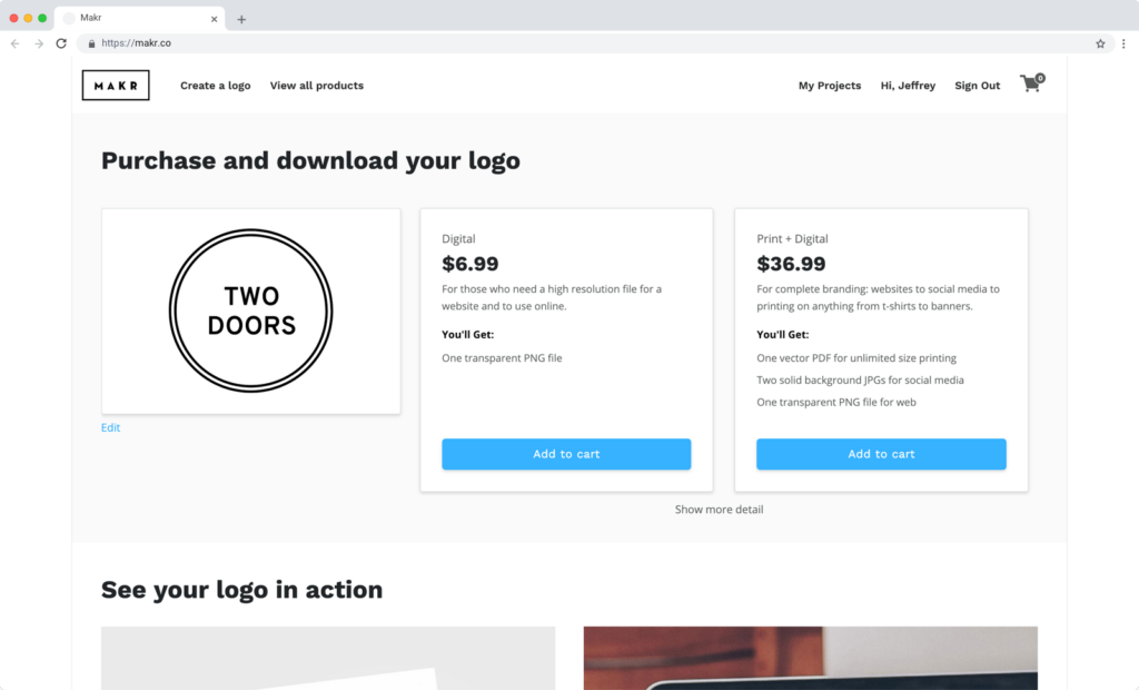 The Makr website empowered small business owners to create custom logos and print products using the Makr Builder. They then purchase the downloadable logo asset or order physical prints, respectively.