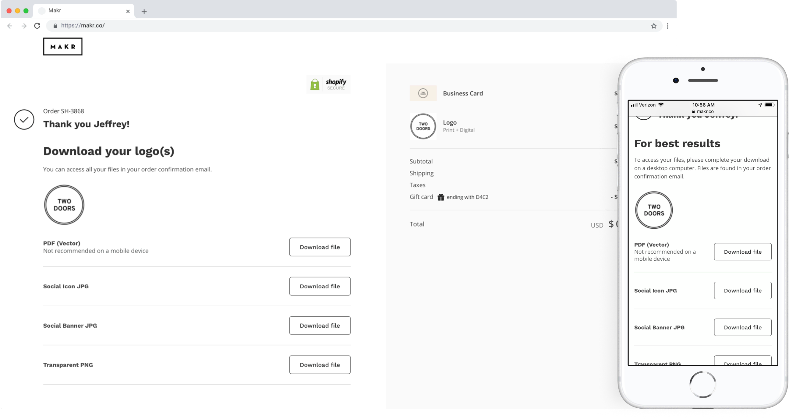 From our user’s perspective, their post-purchase experience with logos includes both downloading and applying the logo within another application or service. I designed an update to the Shopify Order Confirmation page that provides direct access to the individual files, instead of a ZIP file.